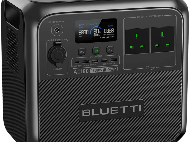 Bluetti AC180P — потужна портативна зарядна станція з акумулятором 1440Wh та номінальною потужністю 1800W. Підходить для резервного живлення будинку, використання під час відключень електроенергії, зарядки побутових приладів та електроніки. Оснащена довговічною батареєю LiFePO4 та підтримує швидку зарядку і підключення сонячних панелей.