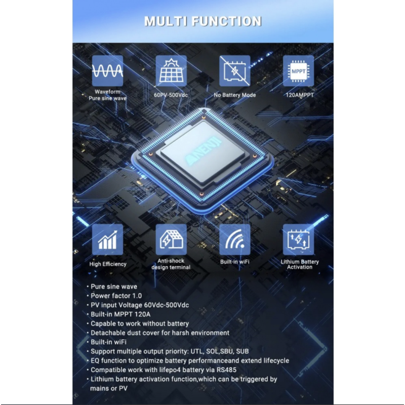 Гібридний інвертор Anenji ANJ-6200W-48V-WIFI потужністю 6,2 кВт — це сучасне рішення для автономного та резервного електроживлення дому, квартири, офісу або невеликого бізнесу. Інвертор поєднує стабільну роботу, низький рівень шуму та зручне керування через WiFi-модуль, що дозволяє контролювати роботу системи дистанційно.